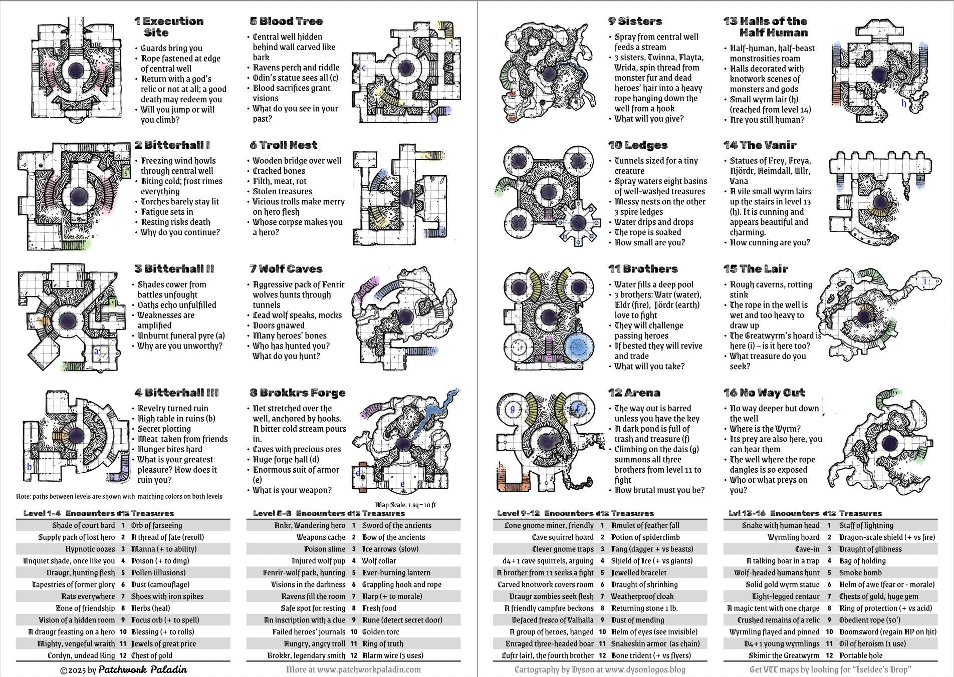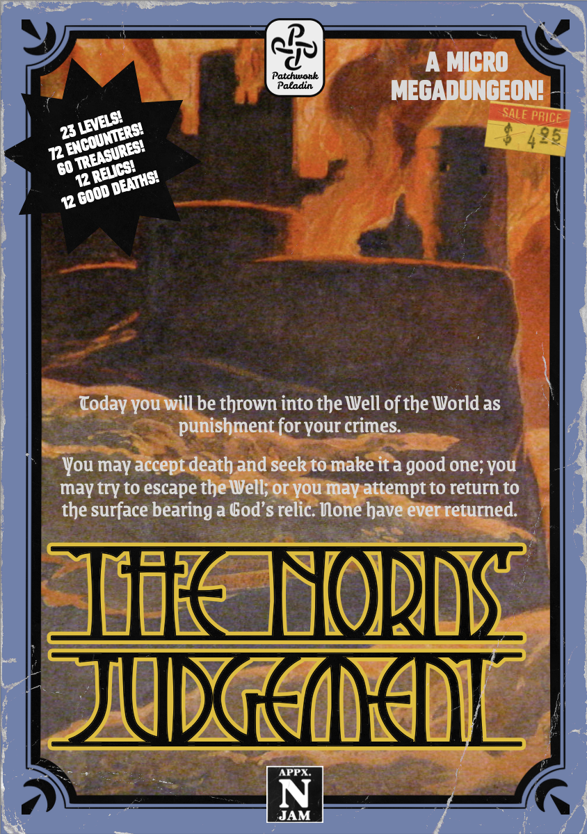 THE NORNS' JUDGEMENT packs 23 levels, 72 encounters, 60 treasures and 12 relics onto both sides of a single page in a dungeon centred around a huge hole in the ground, the Well of the World.
